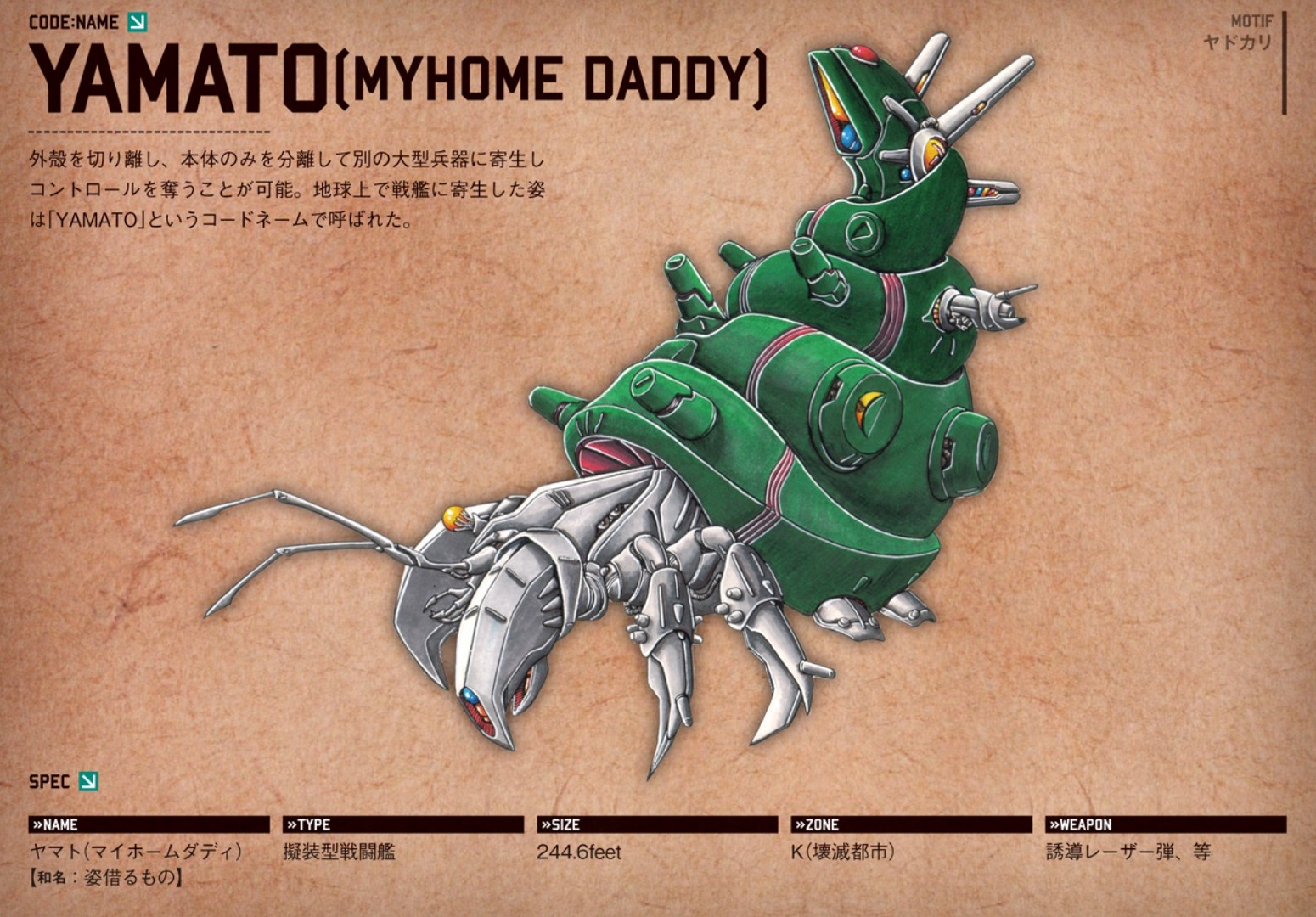 - -Myhome “Yamato” Daddy (yes real canon name) is able to tear apart a huge Yamato-class warship and carry it on its back.